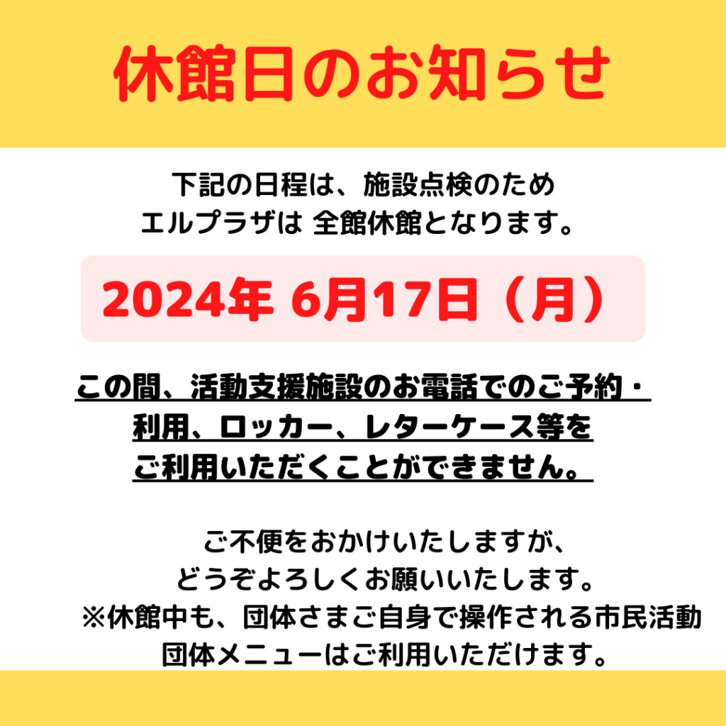 令和6年6月17日(月)は、施設点検のため全館休館となります。