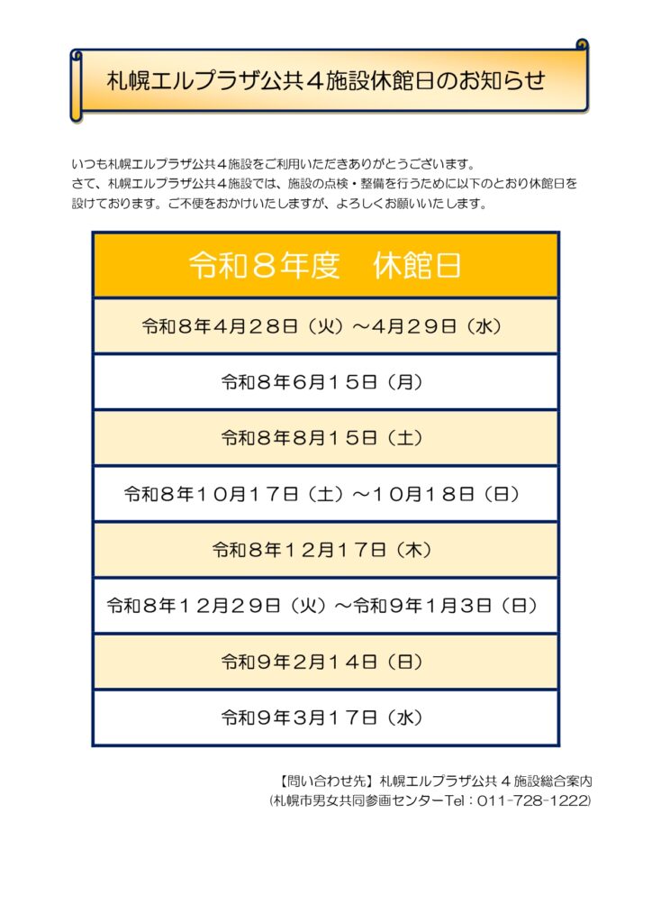札幌エルプラザ公共4施設では、施設の点検・整備を行うために休館日を設けております。