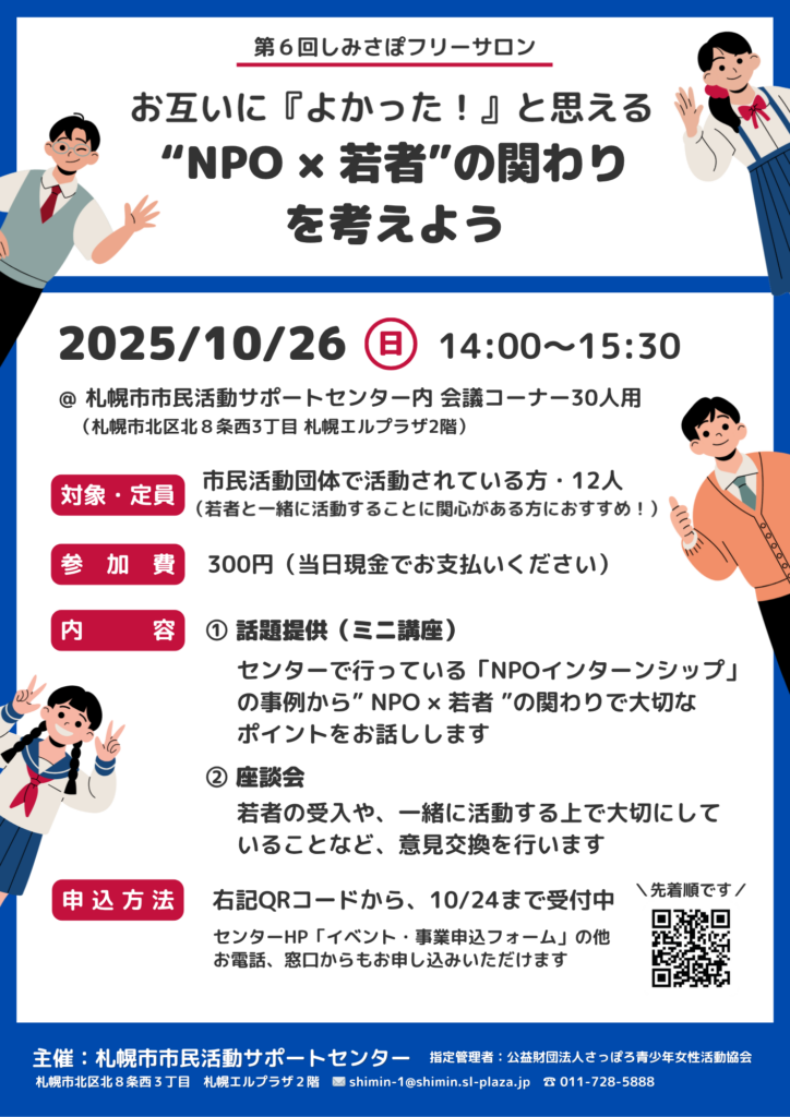 活動をとおして若者と関わる機会がある・若者と一緒に活動することに関心があるNPO・市民活動団体の皆さま、ぜひご参加ください!