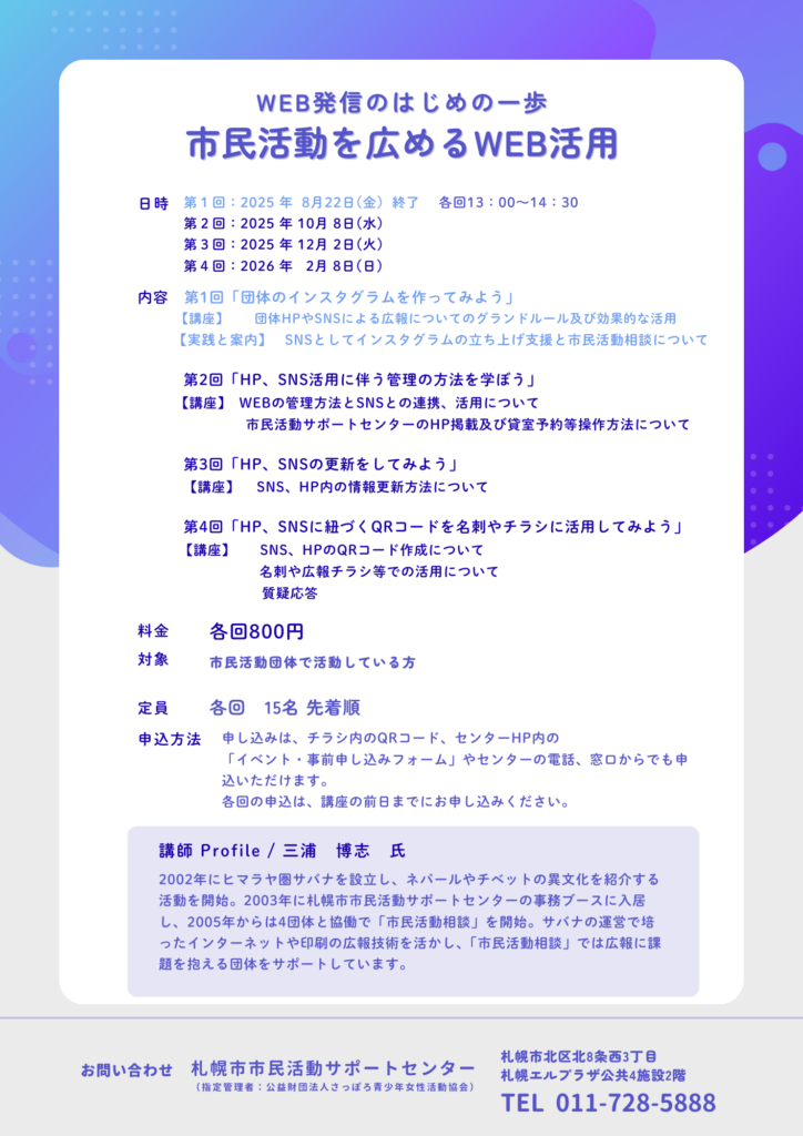 日頃、様々な活動されている団体のみなさまから、「WEBでの活動発信をしたいけど難しい!」「SNS活用の必要性は理解しているけど自分では出来ない!」といった相談をいくつか受けたことがあります。そんな課題をこの機会に一緒に考え、講座と実践で一緒に作ってみませんか?