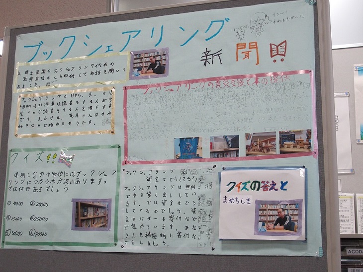 「北海道ブックシェアリング」さんを取材したグループは横向きのかべ新聞を作ったよ!カラーテープを使ったり、カラフルなかべ新聞になってるね!