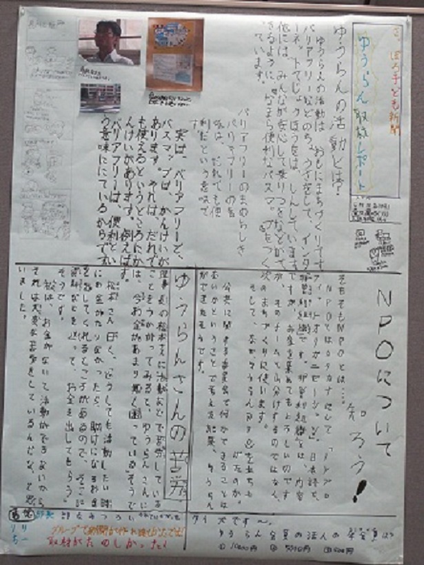 「NPO法人(ほうじん)ゆうらん」さんを取材したグループは縦向きのかべ新聞を作ったよ!