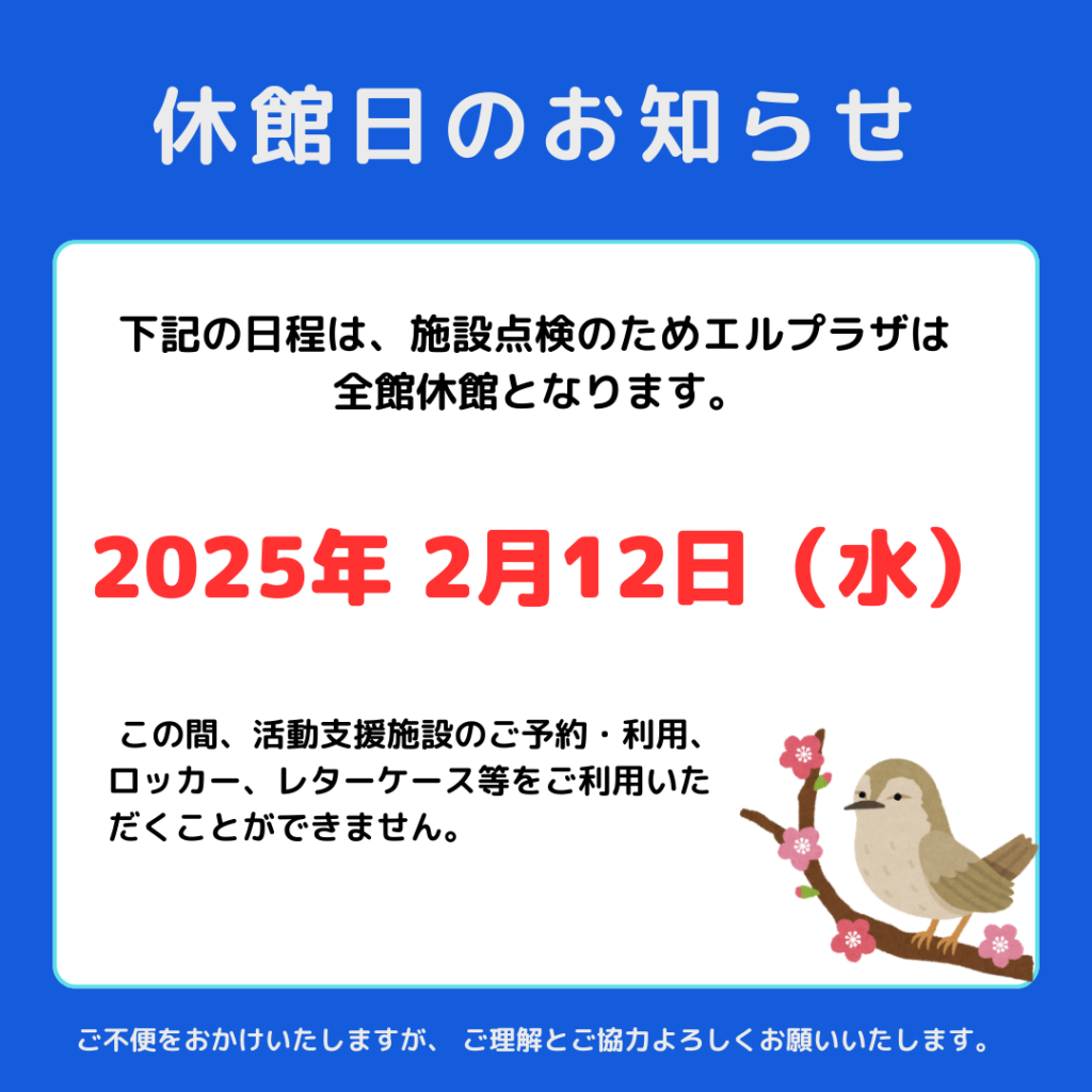 令和7年(2025年)2月12日(水)は、施設点検のため全館休館となります。
