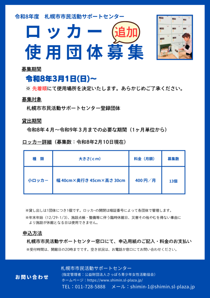 また3月1日(日)8時45分から先着で、空きロッカーの追加募集を行います。