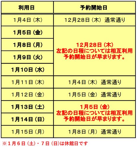 令和5年12月29日(金)から令和6年1月3日(水)、及び 令和6年1月6日(土)・1月7日(日) の期間は、施設点検のため全館休館となります。